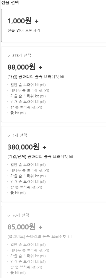 프로젝트 개설 후 후원 모금목표 단계로 개인이 해당 프로젝트가 마음에든다면 최소 모금금액 별로